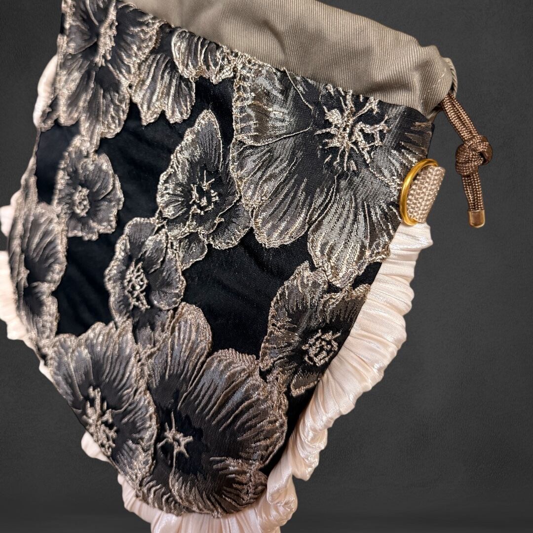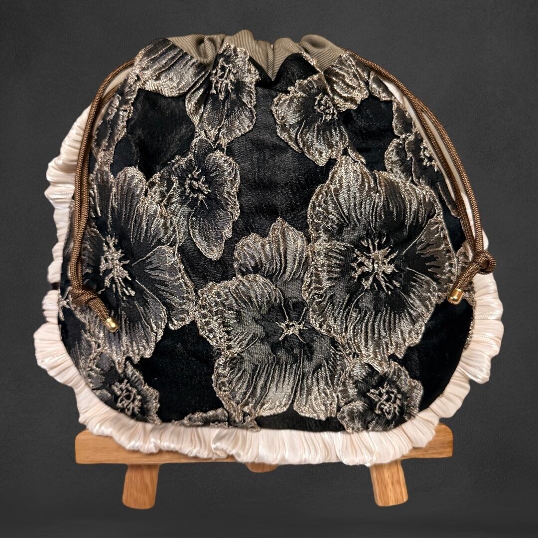 ハンドメイド巾着ショルダーバッグ*ジャガード巾着バッグ*フリル付き巾着*金糸花