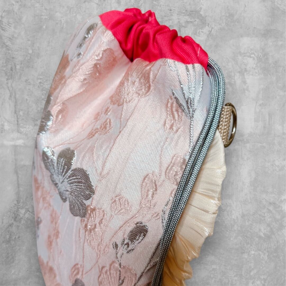 ハンドメイド巾着ショルダーバッグ*ジャガード巾着バッグ*フリル付き巾着*ピンク&シルバー花柄