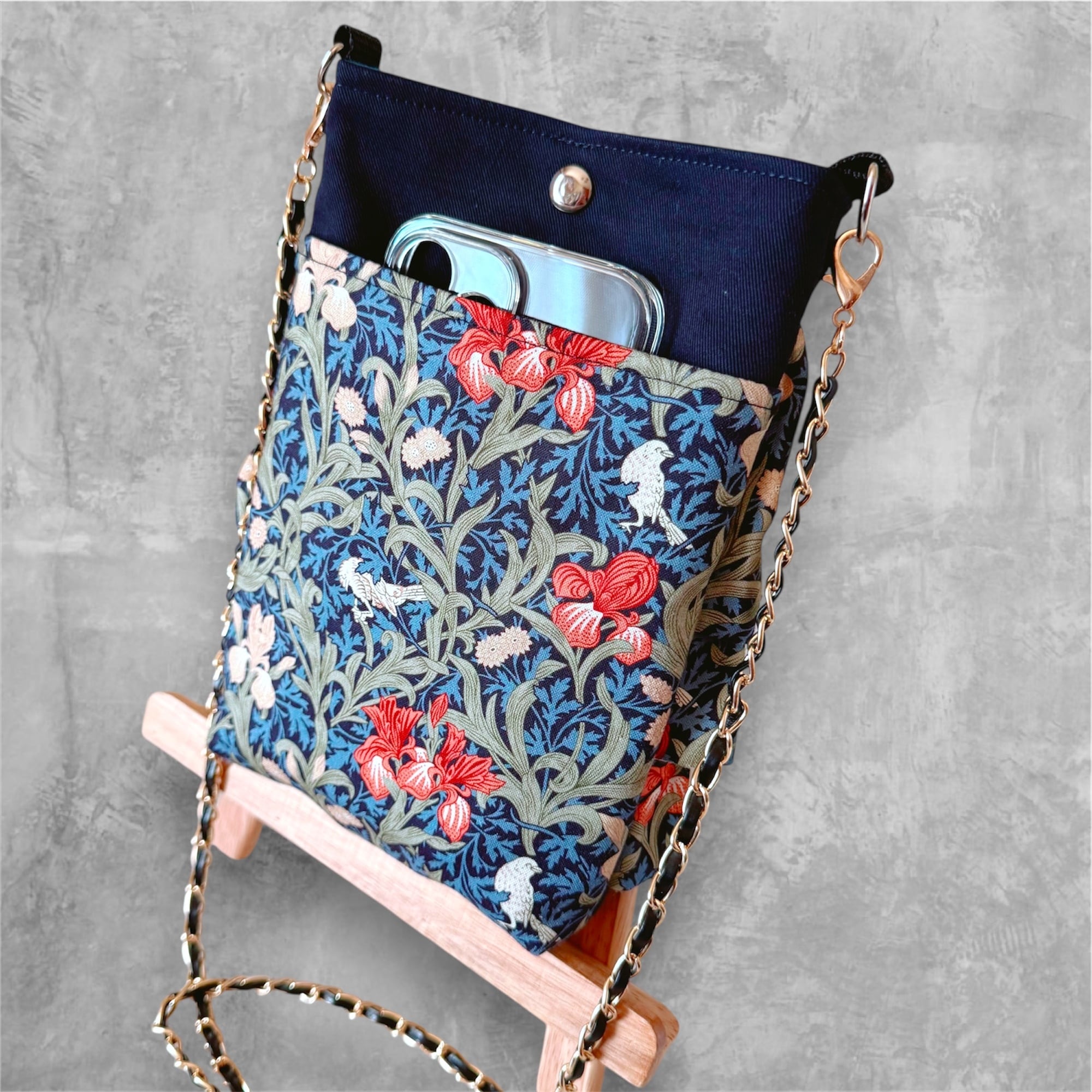 ハンドメイドスマホショルダーバッグ*3段フリルショルダーバッグ*ウィリアムモリス(アイリス ネイビー)