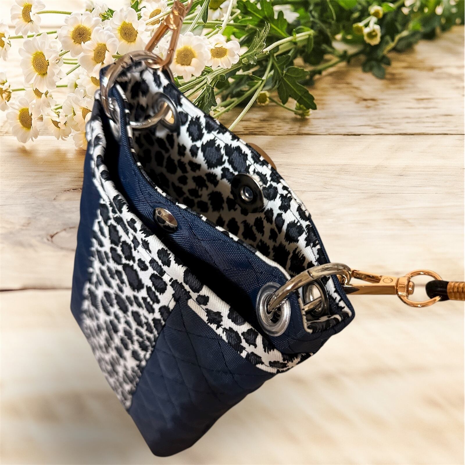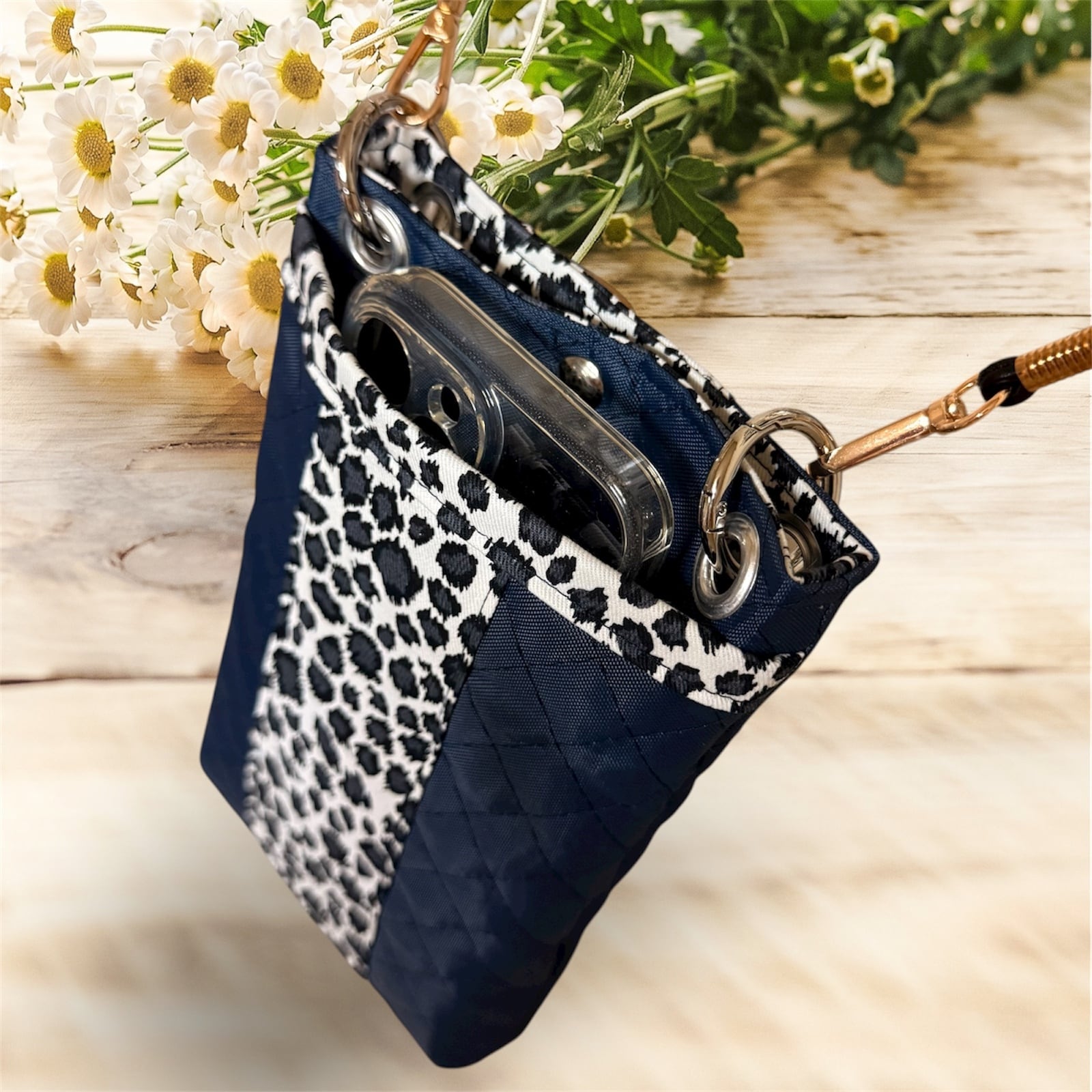 ネイビーのナイロンオックスキルティングに、ヒョウ柄を合わせたスマホショルダーバッグです。